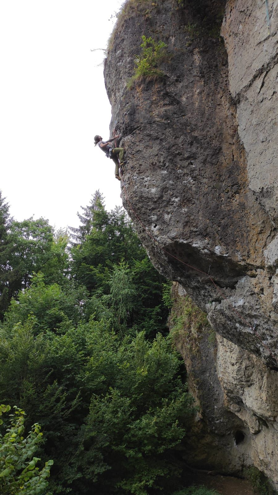 Ziemlich genau da, wo der Typ auf dem Bild klettert, geht eine neue Tour gerade hoch. Wie schwer soll das denn sein, hat die schon mal jemand gemacht?