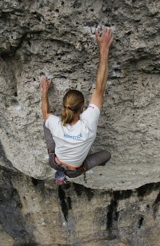 Sarah Seeger in "Red Handed" (9+/10-) an der Ringlerwand (Bild: Holger Heuber)Mit dabei waren Markus Bock (D), Peter Bosma (SWE), Stefan Glowacz (D), Holger Heuber (D), Gerhard Hörhager (AT), Robert Jasper (D), Albert Leichtfried (AT), Stefan Pettersson (SE), Nicola Sartori (IT), Christian ?Schlesi Schlesener (D), Sarah Seeger (D), Matthias Trottmann (CH) und Jorg Verhoeven (NL). Die unterschiedlichen Kletterbiografien und Charaktere ergänzten sich perfekt zu einer äußerst inspirierenden und motivierenden Mischung.