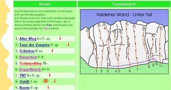 Wer seine Hit- und Wunschliste fleißig gefüllt hat und eingeloggt ist, der kann auf der Felsausgabe anhand der Einfärbung der Routen sehen, was er schon gemacht hat. Blaue Schrift bedeutet "schon gemacht" (Hitliste), lila Schrift "will ich machen" (Wunschliste). Bei den Routen der Hitliste findet man auch noch den Begehungsstil hinter dem Routennamen. Somit hat man sofort einen Überblick, wie "abgegrast" der Fels schon ist.