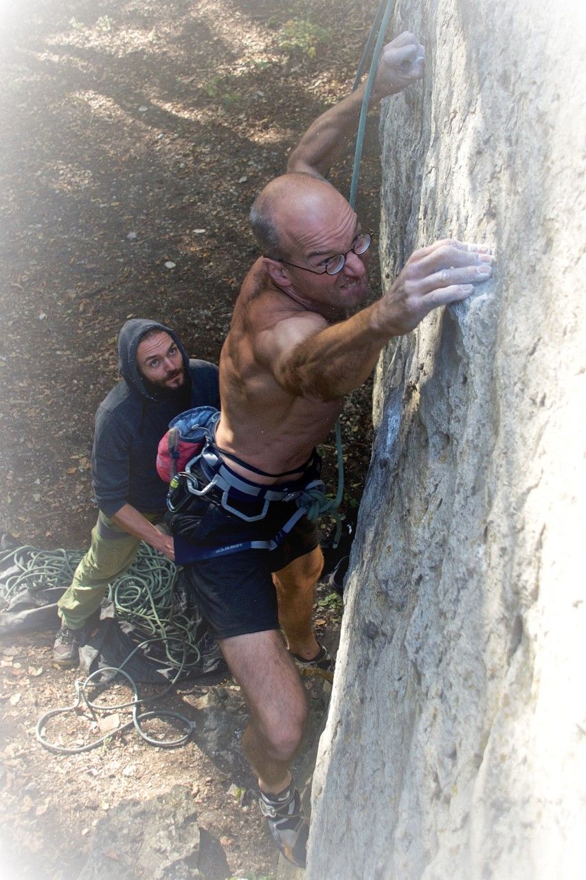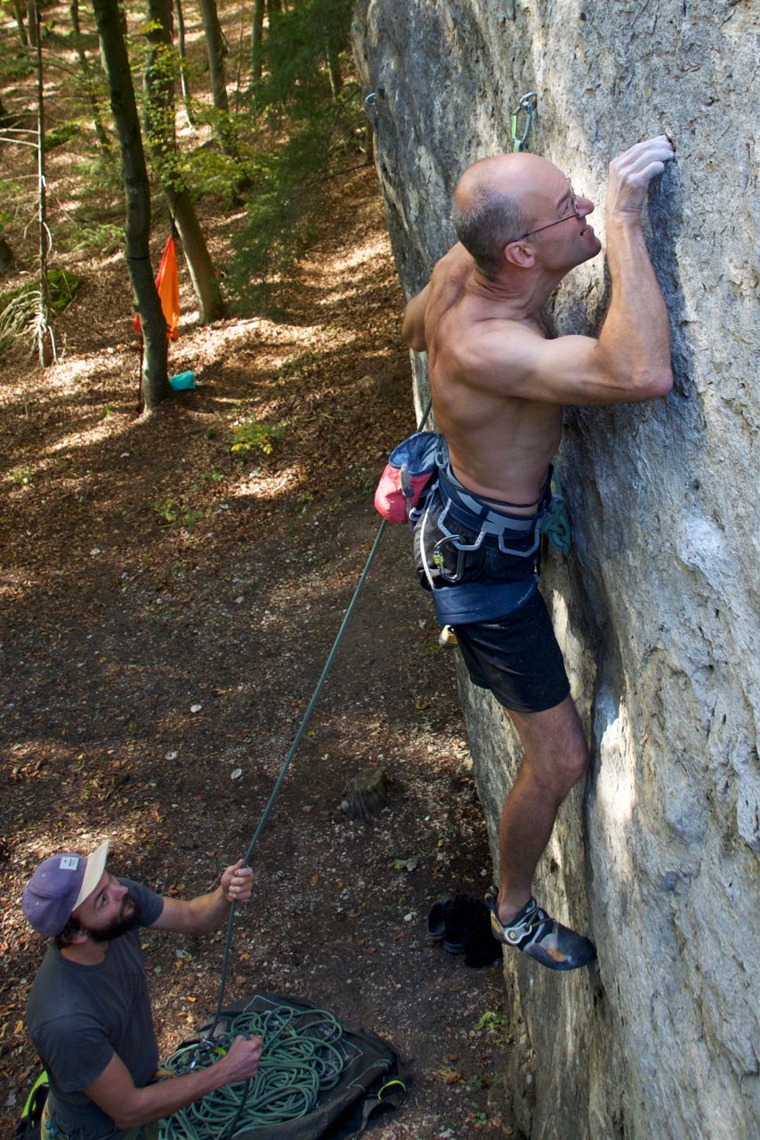 Stefan Reinfelder bei einem Versuch in der Route ´Bad Habit´ (9) an der Röthenbacher Wand (Foto: Norbert Wittmann)