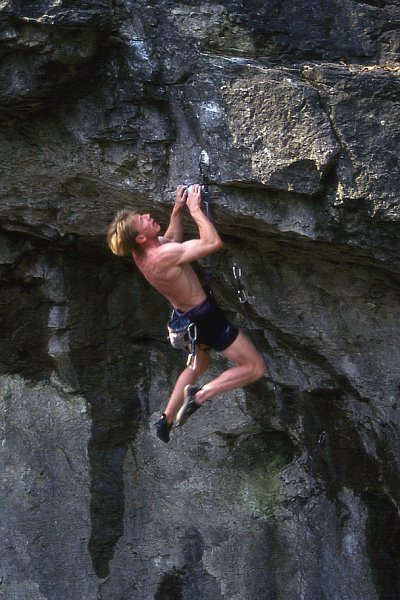 etwas hoher erster haken läßt sich gut anklettern (riß mit ein bischen wand, oder auch umgekehrt) dann 2 m horizontales dach, durch das man mit nur dem einen rieschenorschi in der mitte durchzieht, pumpig an der kante aufstehen, dann zur abrundung noch mal 10 m leicht geneigte platte, zum umlenker noch mal unangenehm weit....dachfans wirds sicher schmecken!