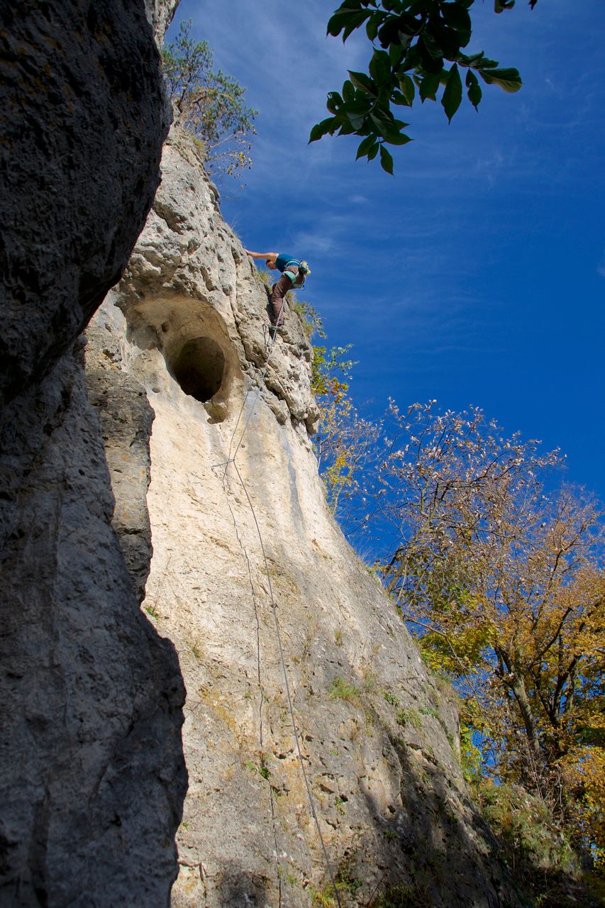 Leichte Plattenpassage unten, dann überhängend aus dem Loch raus: Etwas größenabhängig, aber 1A-Route! Vielleicht erneuert man irgendwann die ältere Umlenköse?