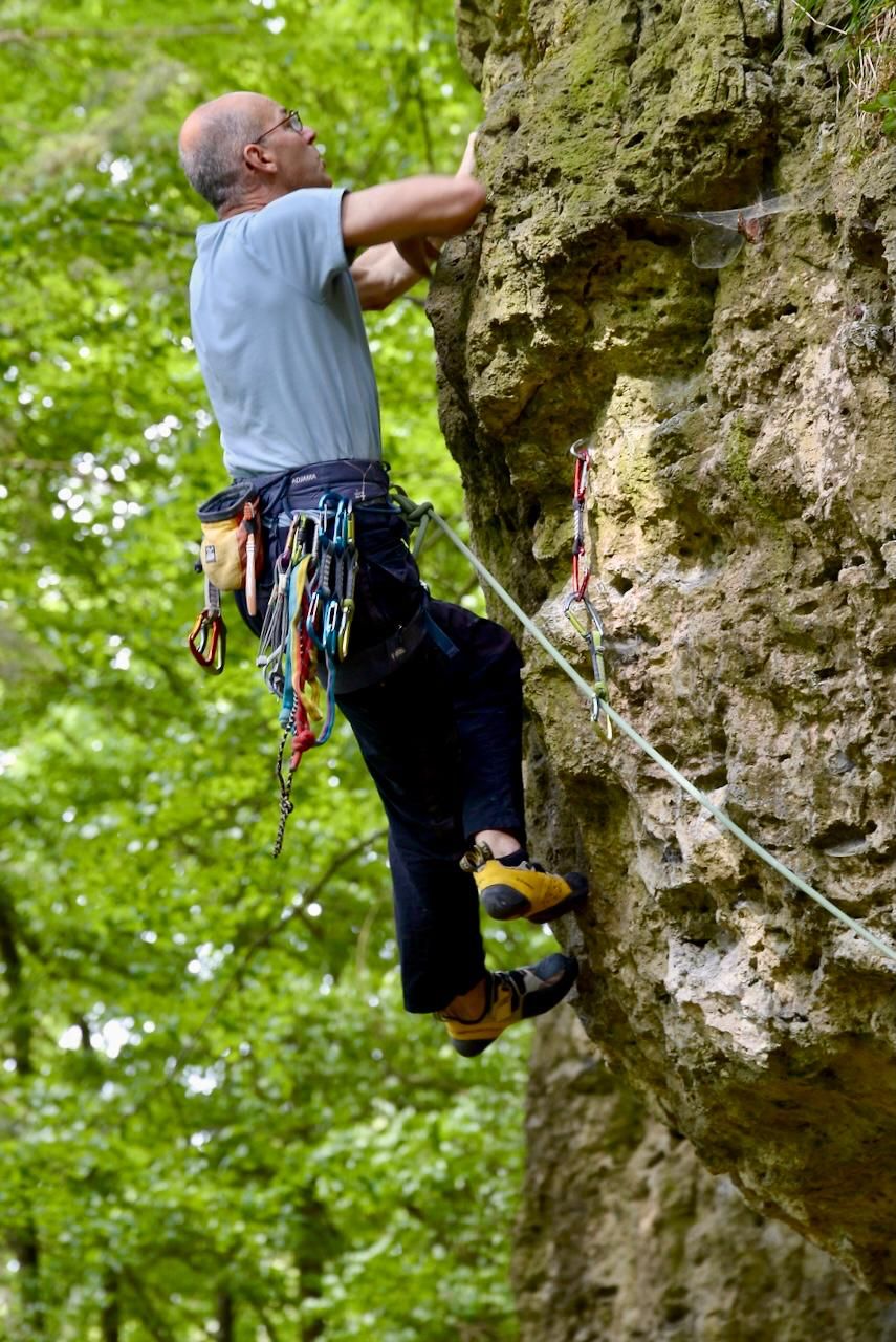 Stefan Reinfelder in der Crux von ´Sansibar Direkteinstieg 7+´ (Bild: Norbert Wittmann)
