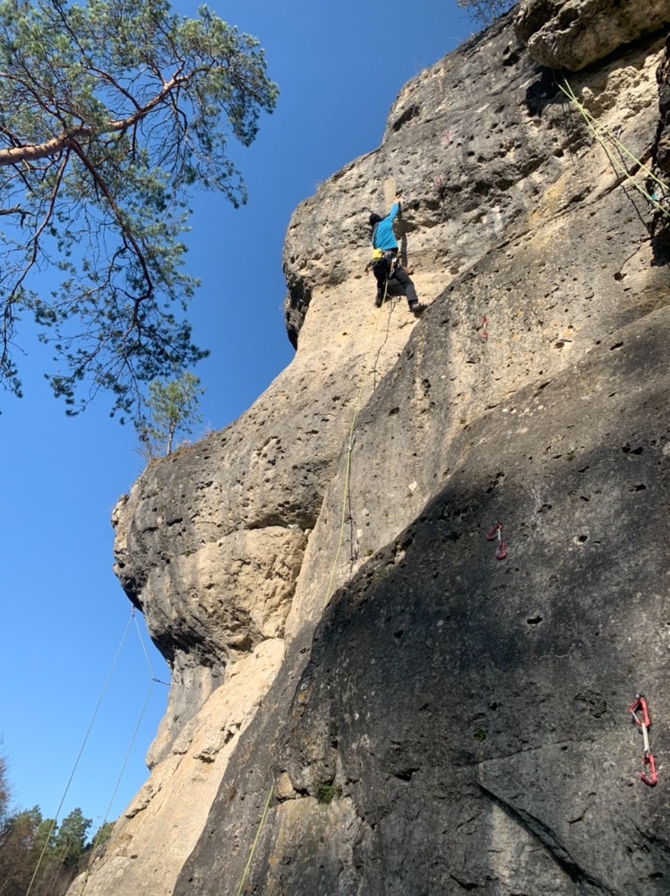 Am Einstieg von links zum 1.Haken-dann ists auch entspannt zu klettern.Crux zweifellos der obere Bauch.Im Moment möglichst nicht ins größte Loch treten,da brütet ein Singvogelpaar.Geht aber auch ohne.Rechts neben dem folgenden Haken versteckt sich ein Super Klinkgriff.Schwerer als die 7- links daneben,also kommt 7-/7 wohl hin.Genuss pur!