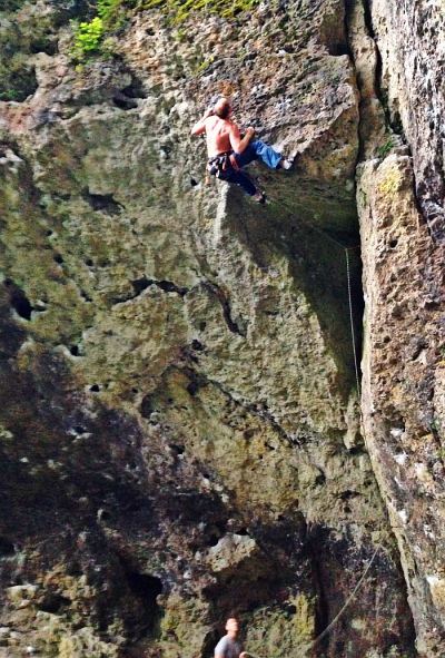 mir hat die Route Spaß gemacht! Schöner Aufrichter am 2. Haken, und dann die Crux wie bereits erwähnt über der Dachkante, wo auf einmal die Griffe kleiner werden und man panisch nach Tritten sucht, bevor die Kraft ausgeht. Natürlich ganz anderer Charakter als die anderen 9-en dort.